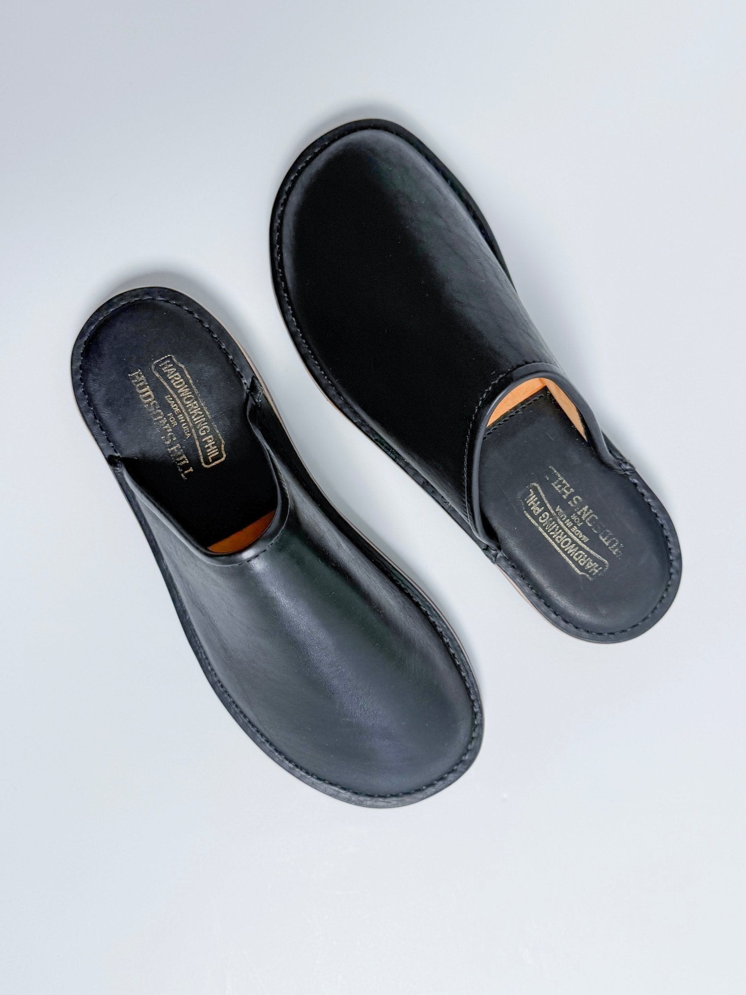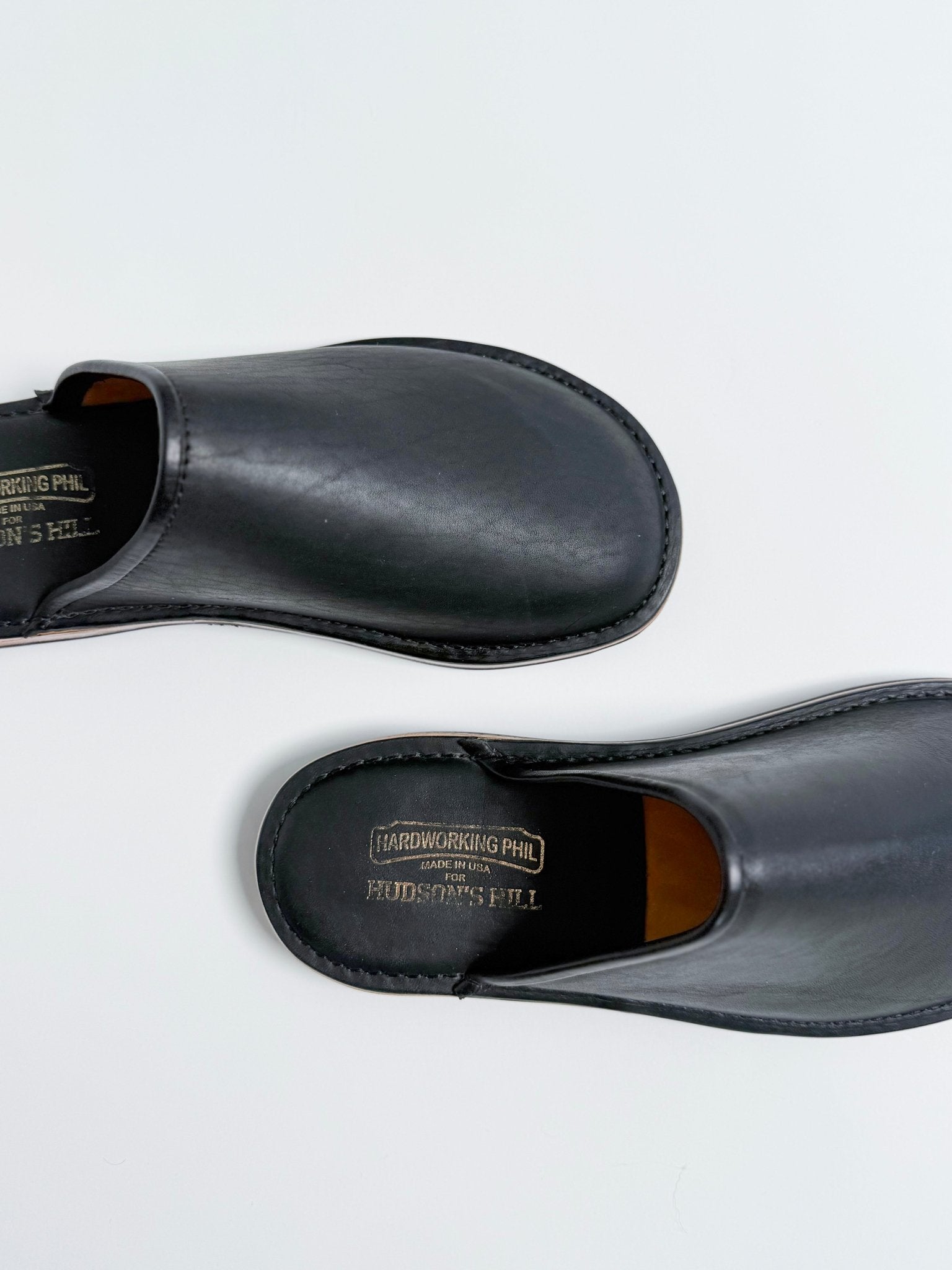 Working over the last few months with Marcell Mrsan of Hardworking Phil, we created what we believe to be the benchmark of Made in USA slide footwear; grail-level unisex slides. The bill of materials, build techniques, and thoughtfulness will make these a fixture in any wardrobe for years to come. This second iteration comes in black leather with a natural lining, creating a soft, even surface throughout the interior.